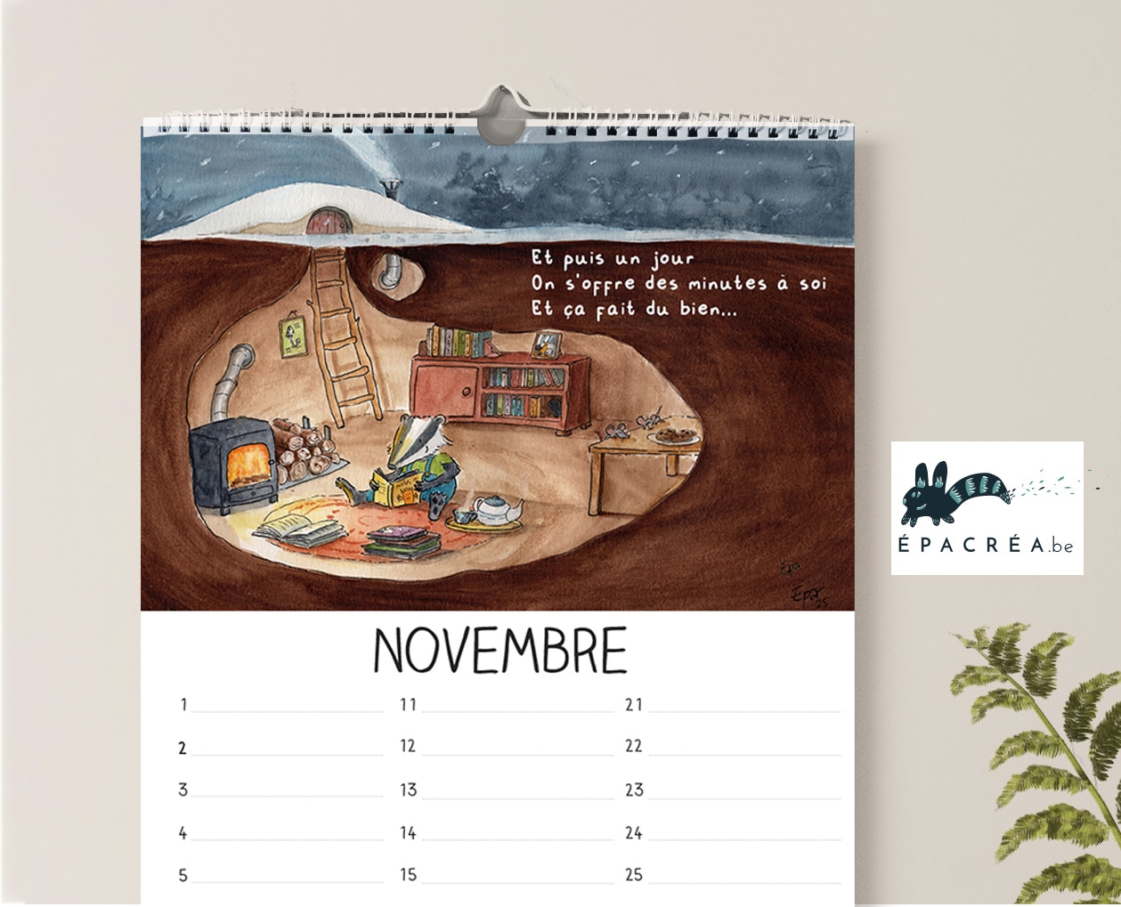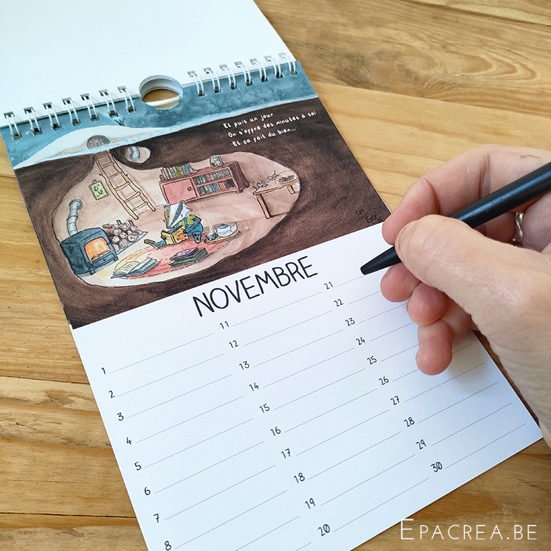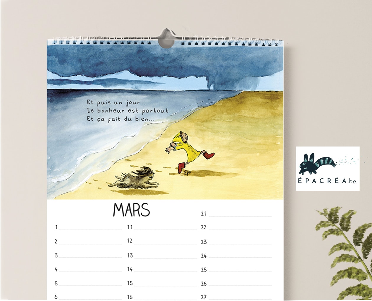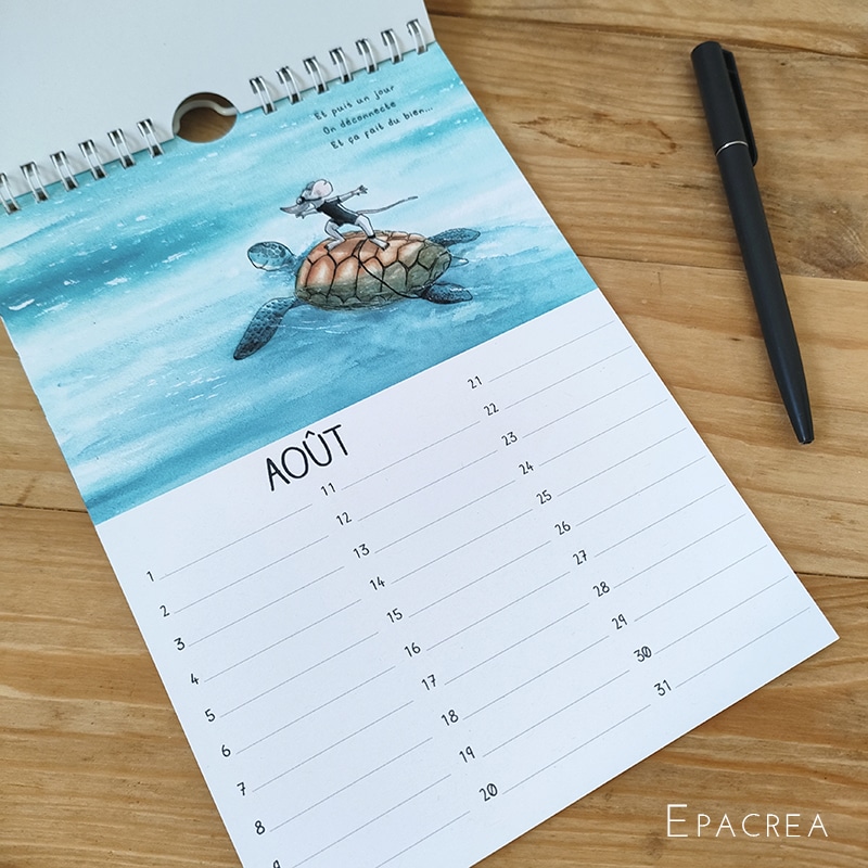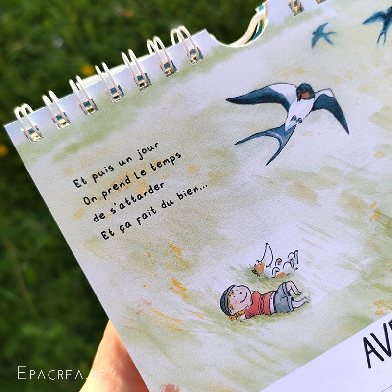 12 aquarelles douces et colorées ainsi qu’une petite phrase positive chaque mois.