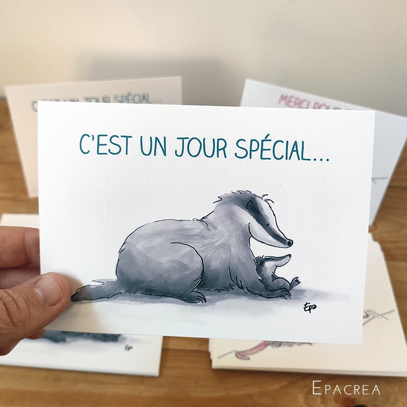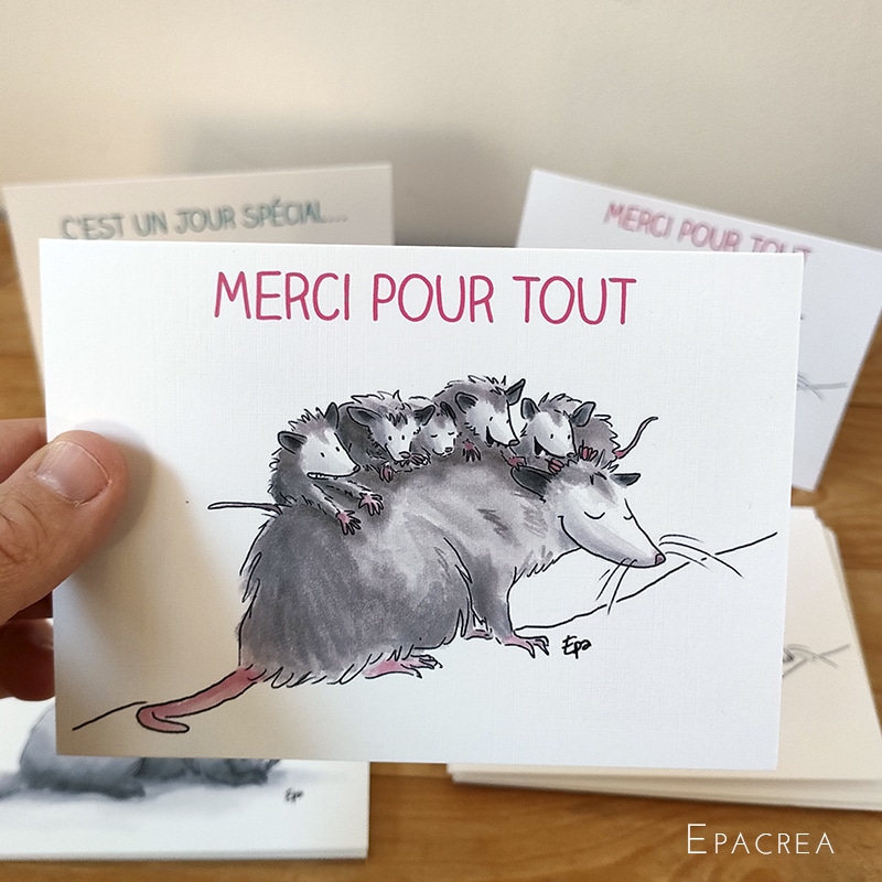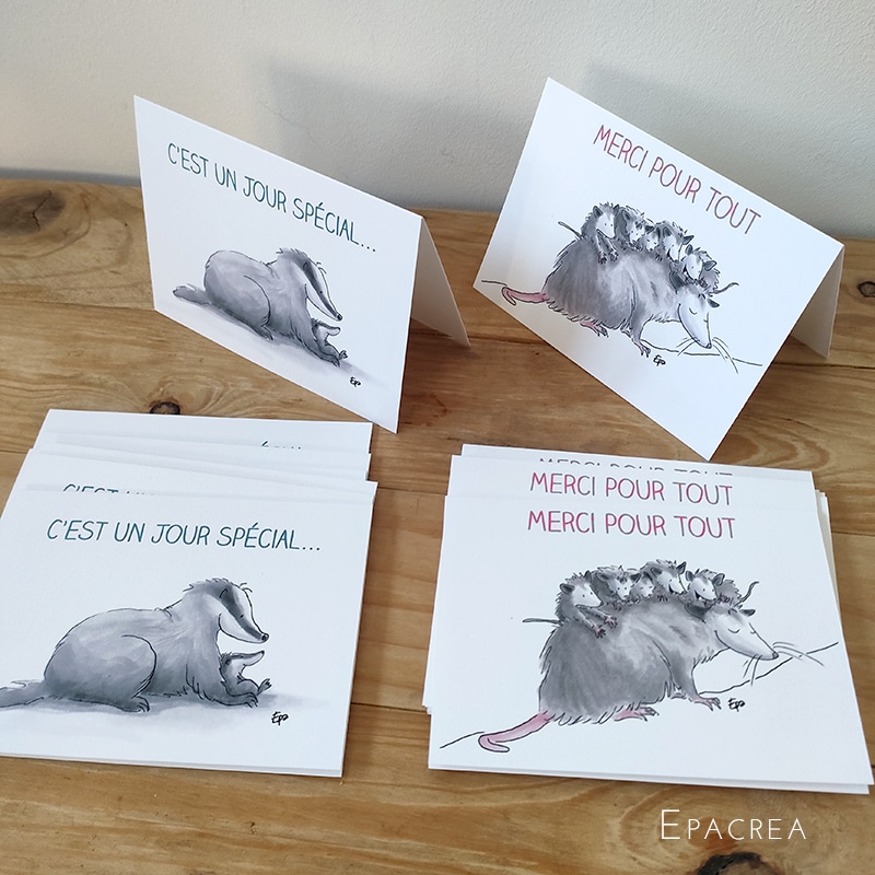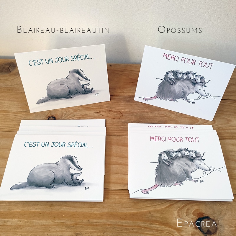 Choix entre la carte Blaireau-blaireautin « C’est un jour spécial » ou Opossums « Merci pour tout ».